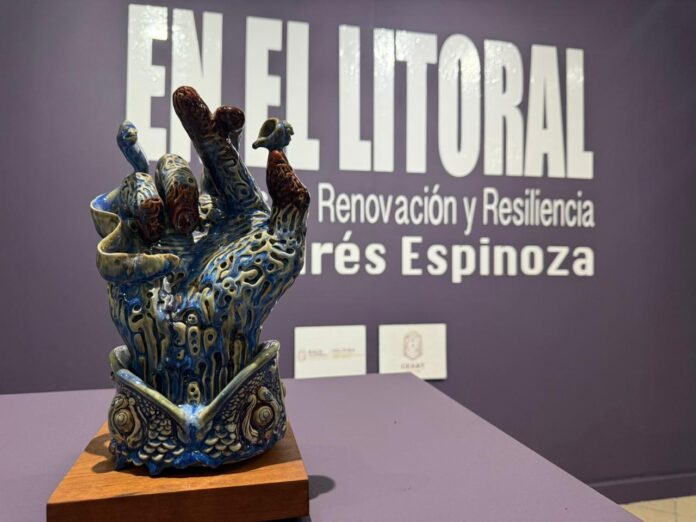En el litoral; metáforas de renovación y resiliencia, Andrés Espinoza expone una serie de piezas escultóricas en cerámica inspiradas en la experiencia sensorial del paisaje costero desértico. La flora, la fauna y los momentos cotidianos del litoral —como pisar el sargazo o el encuentro visual con un león marino— se convierten en el origen de estas obras.