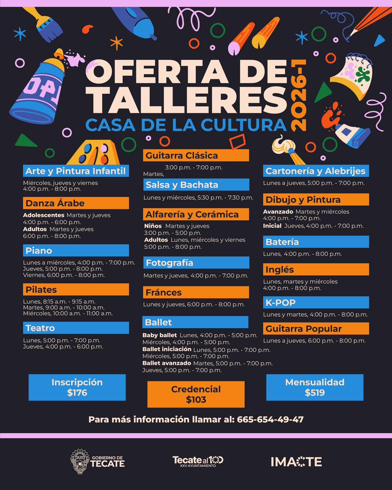 Para este nuevo ciclo, el IMAC pone a disposición de la ciudadanía 17 disciplinas artísticas y culturales, dirigidas a niñas, niños, jóvenes y personas adultas, entre las que se encuentran: arte y pintura infantil, danza árabe, piano, pilates, teatro, guitarra clásica y guitarra popular, salsa y bachata, alfarería y cerámica, fotografía, francés, ballet, cartonería y alebrijes, dibujo y pintura, batería, inglés y K-pop.