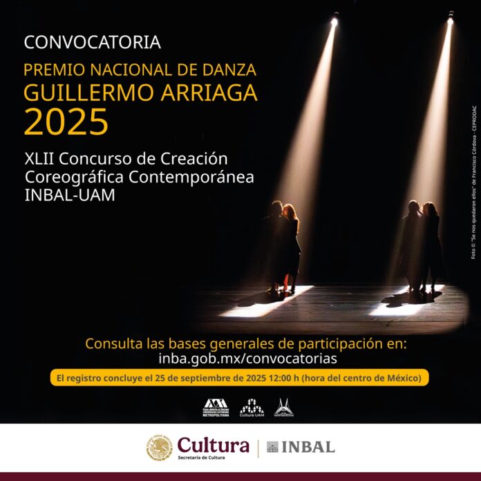 CIUDAD DE MÉXICO, 25 de julio de 2025.- Hoy viernes, la Secretaría de Cultura del Gobierno de México, mediante el Instituto Nacional de Bellas Artes y Literatura (Inbal), a través de la Coordinación Nacional de Danza (CoND) y la Universidad Autónoma Metropolitana (UAM), emitieron la convocatoria para participar en el Premio Nacional de Danza Guillermo Arriaga 2025, XLII Concurso de Creación Coreográfica Contemporánea INBAL-UAM.