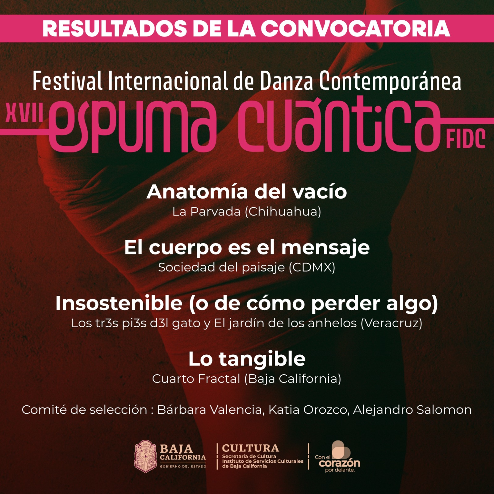 ENSENADA BC, 03 de abril de 2026. – Proyectos dancísticos de Chihuahua, CDMX, Veracruz y Baja California resultaron seleccionados para integrar la programación del XVII Festival Internacional de Danza Contemporánea Espuma Cuántica (FIDC), que se llevará a cabo del 26 al 30 de mayo de 2026 en el Centro Estatal de las Artes (CEART) Ensenada.
