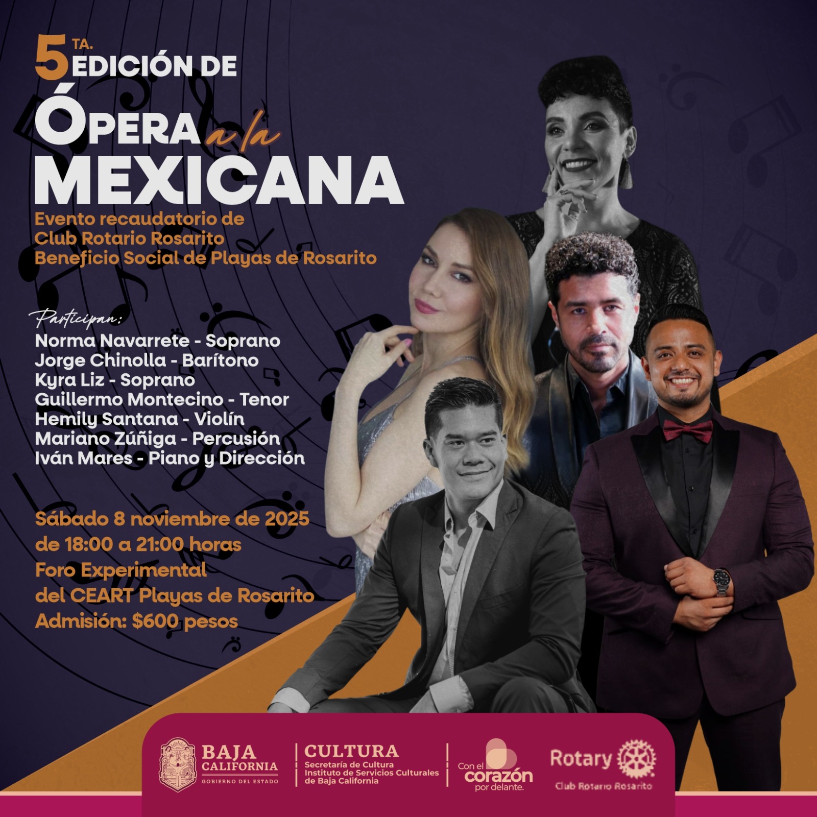 PLAYAS DE ROSARITO BC, 31 de octubre de 2025.– El Centro Estatal de las Artes (CEART) Playas de Rosarito abrirá sus puertas a una noche de gala con la quinta edición de Ópera a la Mexicana, un evento organizado en colaboración con el Club Rotario Rosarito con el propósito de recaudar fondos para programas de beneficio social en la comunidad, como becas para cursos y talleres artísticos, así como apoyo a programas de atención múltiple, entre otros.