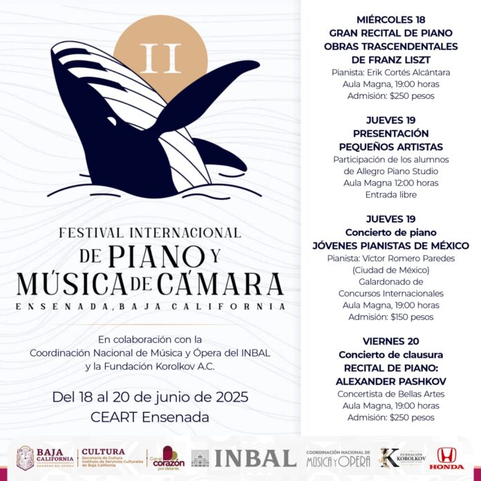 ENSENADA BC, 17 de junio de 2025.- El Centro Estatal de las Artes Ensenada (CEART Ensenada), en colaboración con la Fundación Korolkov A.C., se complace en anunciar la segunda edición del Festival Internacional de Piano y Música de Cámara, que se llevará a cabo del 18 al 20 de junio en el recinto cultural.