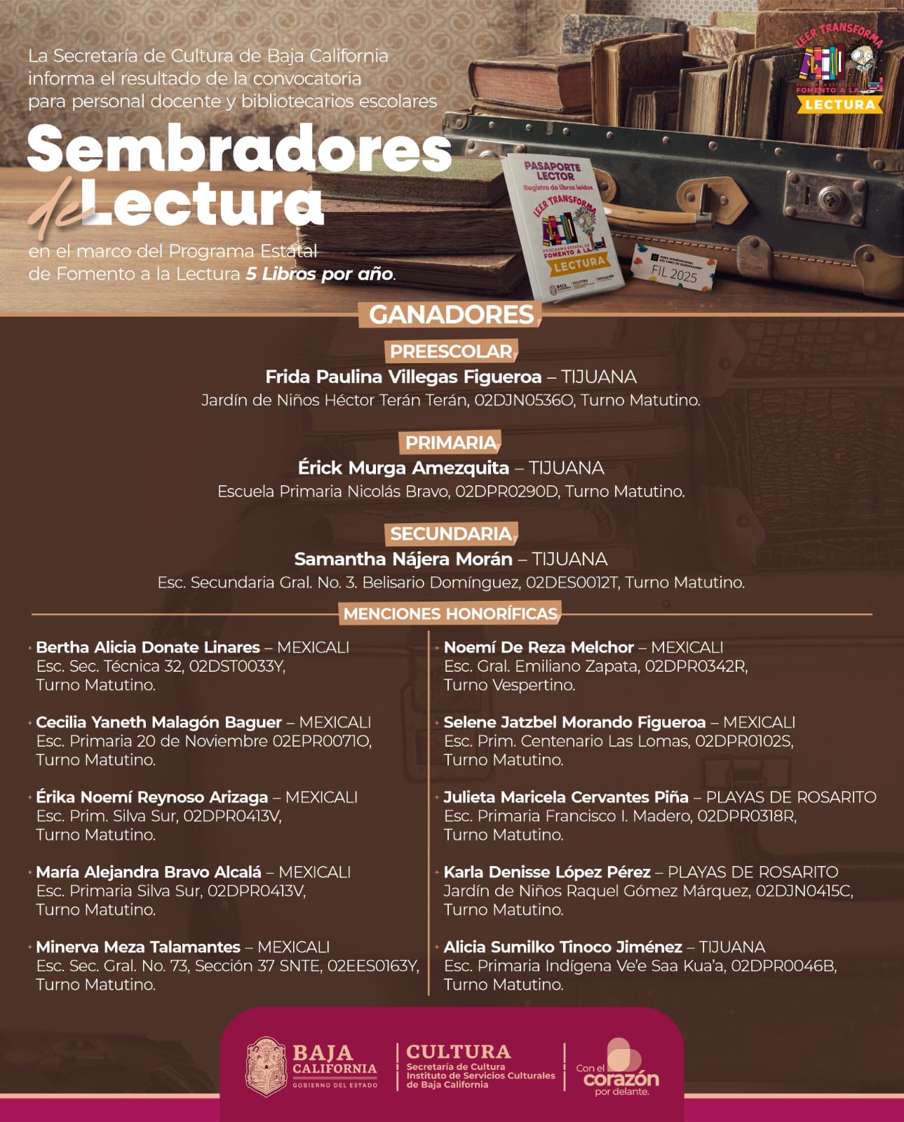 MEXICALI BC, 29 de octubre de 2025.- La Secretaría de Cultura de Baja California dio a conocer a las y los ganadores de la convocatoria “Sembradores de Lectura 2025”, iniciativa del Programa Estatal de Fomento a la Lectura 5 Libros por Año que reconoce el compromiso del personal docente y bibliotecario que promueve la lectura en las escuelas de educación básica.