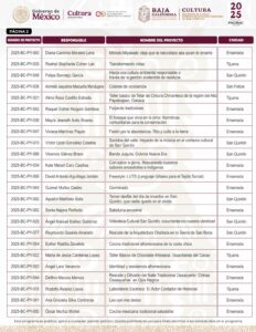 San Quintín y Tijuana mantienen una participación equilibrada, con 11 y 10 proyectos respectivamente, mientras que Mexicali cuenta con 6 proyectos ganadores, todos con enfoque en identidad, comunidad y medio ambiente.