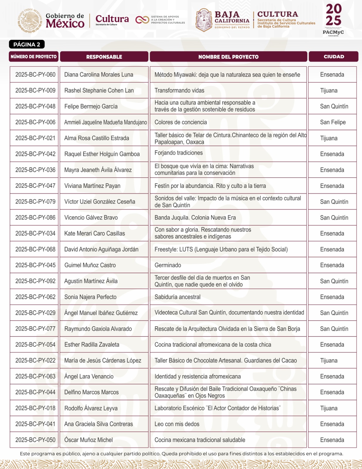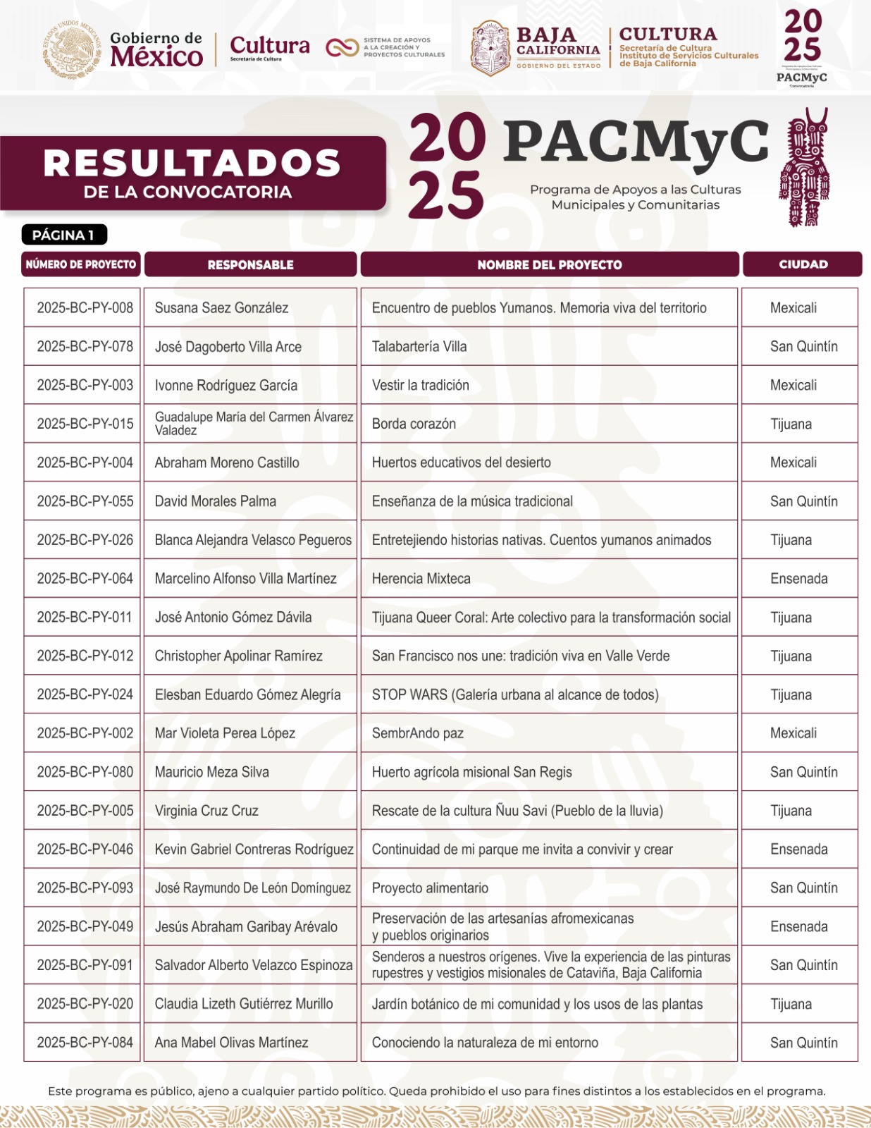 MEXICALI BC, 27 de octubre de 2025. – Con el objetivo de impulsar el desarrollo de proyectos culturales comunitarios que promuevan la creatividad, la autogestión y la investigación local, el Instituto de Servicios Culturales de Baja California (ISCBC) dio a conocer que resultaron beneficiados un total de 44 proyectos, resultado de la convocatoria del Programa de Apoyos a las Culturas Municipales y Comunitarias (PACMyC) 2025.