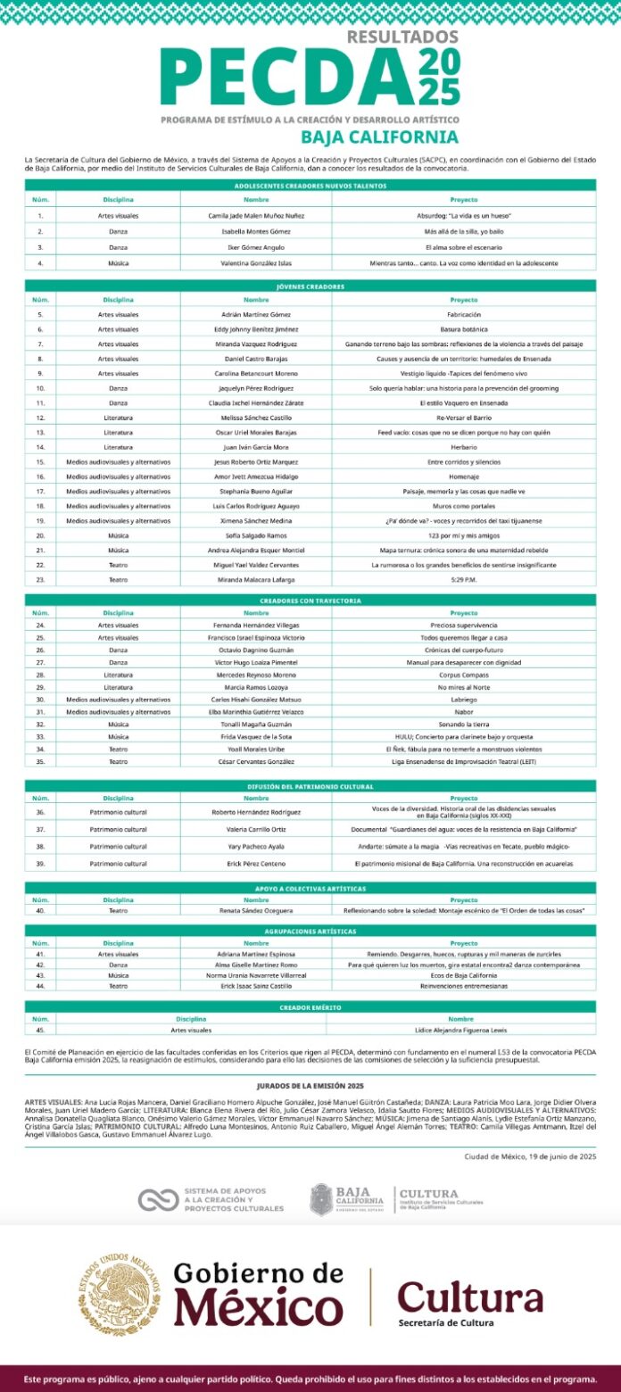 MEXICALI BC, 19 de junio de 2025. – La Secretaría de Cultura del Gobierno de México, a través del Sistema de Apoyos a la Creación y Proyectos Culturales (SACPC), en coordinación con el Gobierno del Estado de Baja California, da a conocer los resultados de la convocatoria del Programa de Estímulos a la Creación y Desarrollo Artístico (PECDA) Baja California 2025.